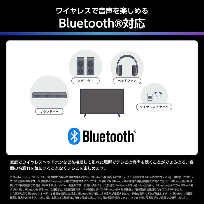 ※Bluetooth(R)ヘッドホンとテレビを無線でつないで音声を楽しむには、Bluetooth信号の「A2DP」という「音声を送るためのプロファイル」(規格)に対応している必要があります。