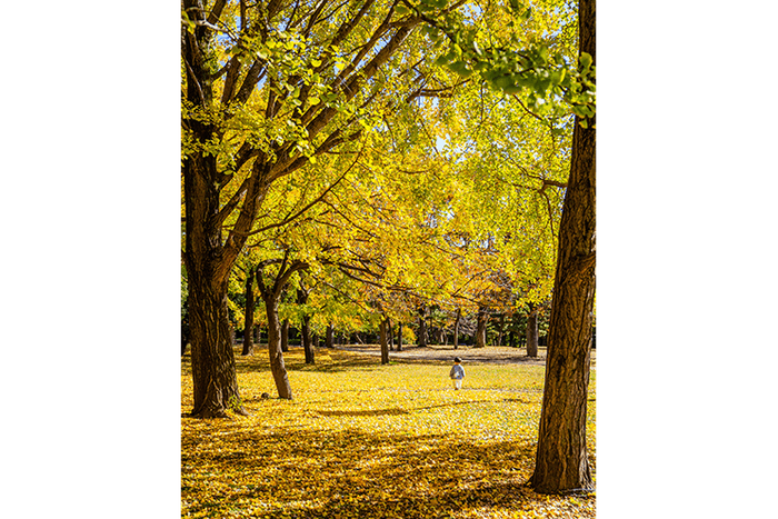 紅葉をテーマにしたコンテストには珍しく、紅葉が全面的に出るのではなく、背景に紅葉の色を持たせることで幻想的な空間を演出している作品です。東京のど真ん中だとは想像できないほどの「森感」。都会のオアシスを体現しています。