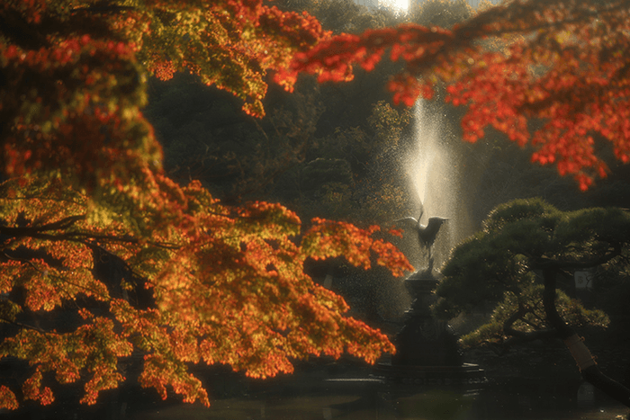 日比谷公園のこちらの噴水は、日比谷公園の中でもフォトスポット。しかしながら、こんなにも幻想的に仕上げた作品は、なかなか見たことがありません。もみじ色の艶やかなステンドグラスのような紅葉に、ソフトでふんわりさせながらも躍動感ある水しぶきが美しい作品でした。