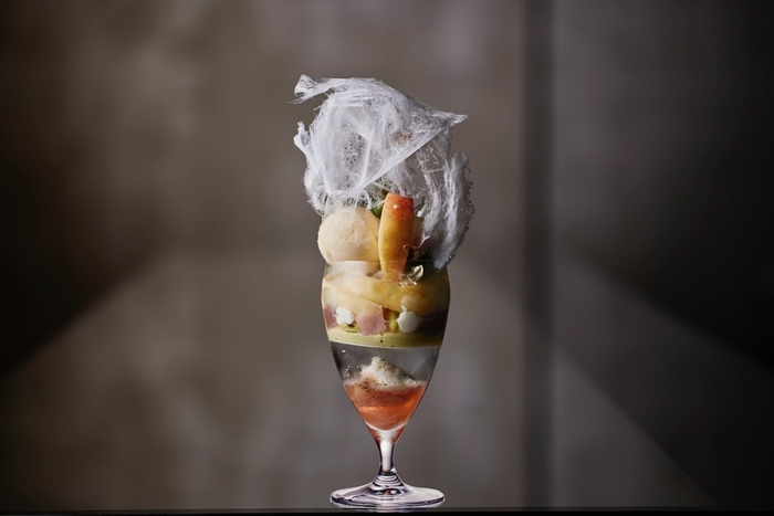 インスピレーションは「日本の桃クリームあんみつ」。甘く瑞々しい桃を中心に、蓬白玉や三杯餅といった和のお菓子、アクセントの生姜、あんみつには欠かせない緑茶をクレムーやジェラートとして重ね合わせ、1台のパフェに仕立てております。