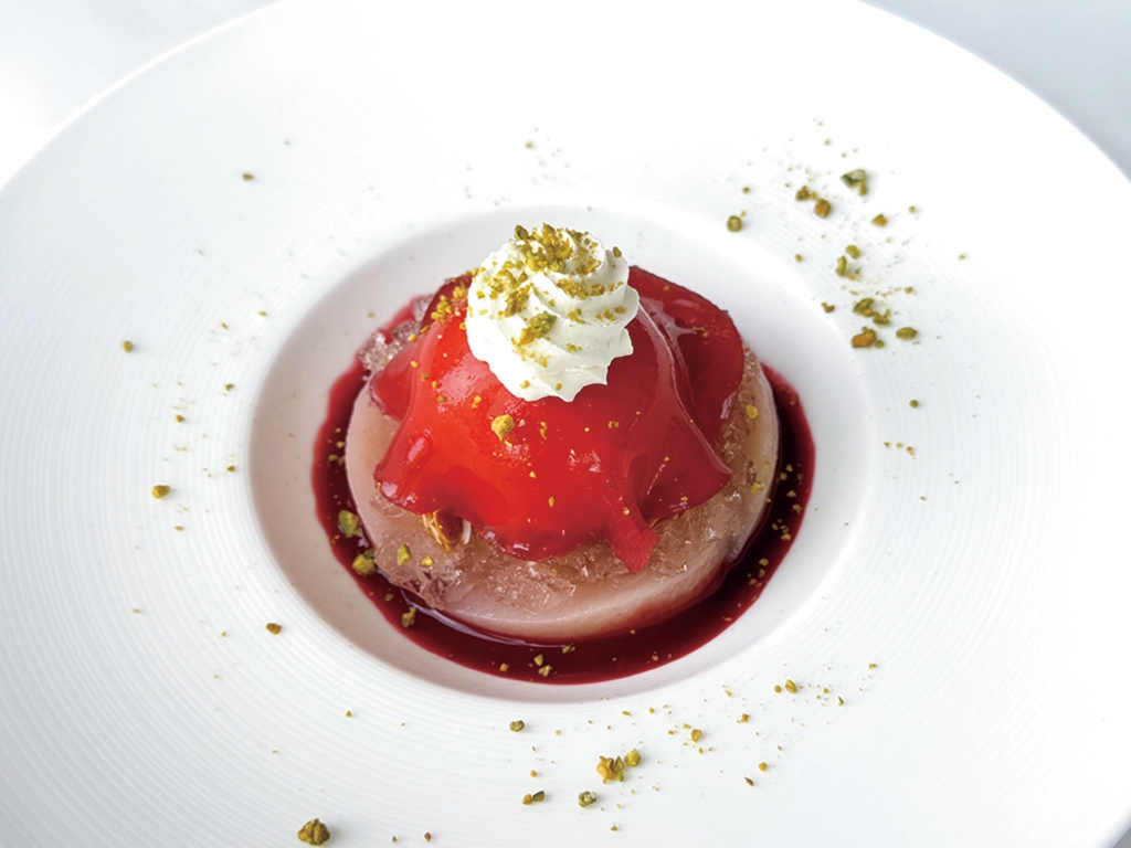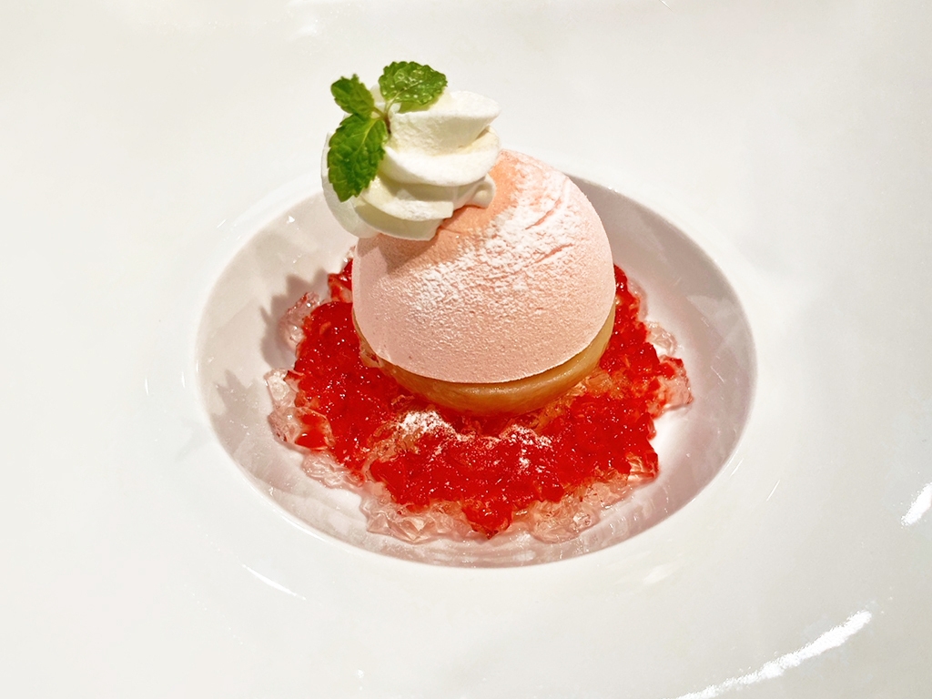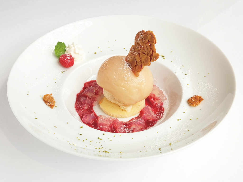 白桃のゼリー、フランボワーズソース、スポンジ、バニラアイスクリームを幾重にも重ね、その上に白桃のコンポートを大胆に盛り付けました。ひと口ごとに、みずみずしい果汁が口いっぱいに広がります。おすすめのペアリングは、ロゼのスパークリングワイン。白桃の熟した甘みと絶妙に調和します。