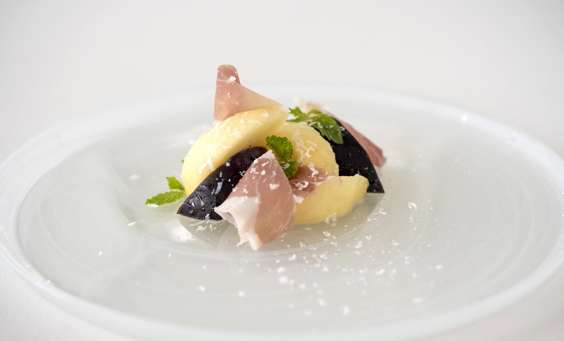 泉州水茄子と白桃、フランス産ジャンボン・クリュ ミントとリコッタサラータのアクセント
