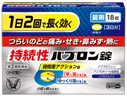 「持続性パブロン錠」は、日中は薬を飲みづらい、飲み忘れてしまいがちでなんとかしたいといったかぜ薬ニーズと、夜間~早朝にかけて呼吸器症状や発熱などの症状が悪化しやすいというかぜの病態を考慮した、1日2回タイプのかぜ薬です。朝と夜1日2回の服用で、つらいかぜ症状を緩和します。仕事中に薬を飲みづらいという方や、家事や育児などで日中忙しく過ごされている方におすすめしたい製品です。