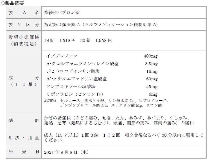 「パブロン」は、かぜ薬から周辺アイテムに至るまで、かぜ総合ブランドとして幅広い商品をラインアップしております。今後も、生活者の皆さまの身近なかぜ総合ブランドとして、様々なニーズに対応する製品開発を続けてまいります。