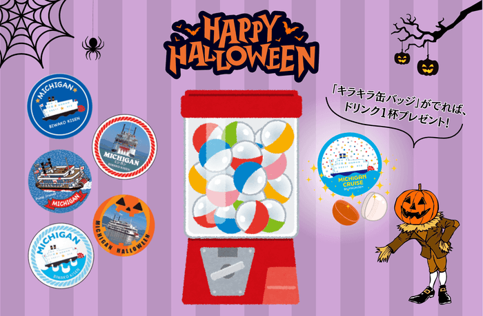 今年も船内に缶バッチガチャが登場! オリジナル缶バッジは全部で6種類。キラキラ缶バッジが当たった方には、3Fミシガンバーで販売中のお好きハロウィンドリンクを1杯プレゼント!