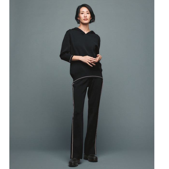 雨の日もアクティブに過ごせるヘルシー美人のためのニットセットアップもご用意しました。さらっと気持ちのいいニット素材にはっ水機能を加えたこちらのアイテムは、身体のラインを拾いにくい構築的なフォルムと軽さが特徴です。かぶり型のパーカーには立体的なフード、7分袖、ドロップショルダーの軽快なデザインが施され、リブ編みの配色ラインが爽やかな印象を添えます。パンツは脚長に見えるセンタータック。高さのある靴にも合うよう、裾にベント(切れ込み)を設けています。さらに、美脚効果を高めるサイドラインも特徴となっております。