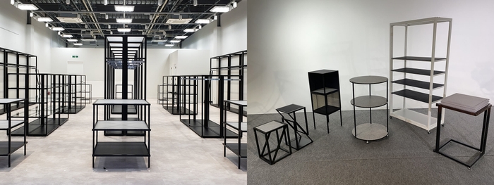 廃棄衣類を原料としたリサイクルボード「PANECO(*1)」を使用した什器を展示します。「PANECO」は、焼却処分される布や合成皮革、製造工程で生じる端材を加工した高品質なリサイクルボードです。現在、大量の衣類が廃棄される「ファッションロス」が世界的に深刻な問題となっています(*2)が、「PANECO」を使ったオリジナル什器は、一般的な什器と比べ、原材料の消費を抑え、ファッションロスと環境負荷の軽減を実現しています。会場では、什器の質感やデザインを直接確認することができます。