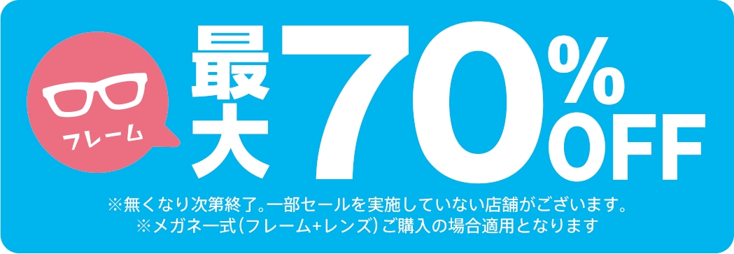 対象フレームが通常価格から30%・50%・最大70%OFF!※メガネ1組(フレーム+レンズ)ご購入時の適用となります。
