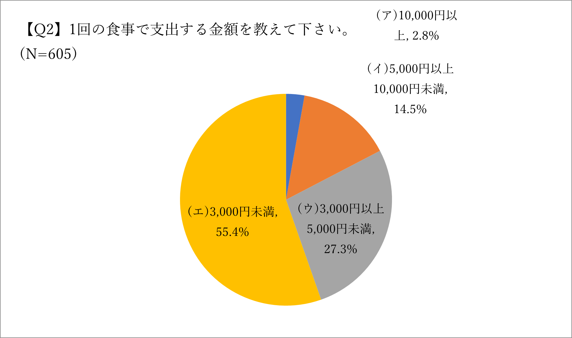 また1回あたりの支出については、3,000円未満が最も多く55.4%の割合も占めましたが、3,000円以上~5,000円未満:27.3%と高い数字を占めました。比較的高額の5,000円以上~10,000円未満:14.5%、10,000円以上:2.8%と少数の割合となりました。