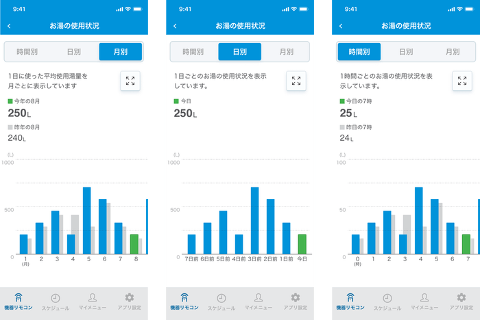 在宅時間が長くなると気になるのが水道代の増加です。『Daikin Smart APP』は、月・日・時間単位で給湯使用量を見える化します。さらに、前日の同時間帯や前年同月と比較することもでき、使用量の管理をサポートします。