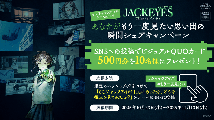 全世界で累計1,490万人以上を動員しているリアル脱出ゲームを企画制作する株式会社SCRAP(本社:東京都渋谷区、代表:加藤隆生)は、『JACKEYES 7月のトロイメライ』のプレイ開始に先駆けて、本日10月23日(木)より「もし『ジャックアイ』が手に入ったら?あなたがもう一度見たい思い出の瞬間シェアキャンペーン」を開催します。