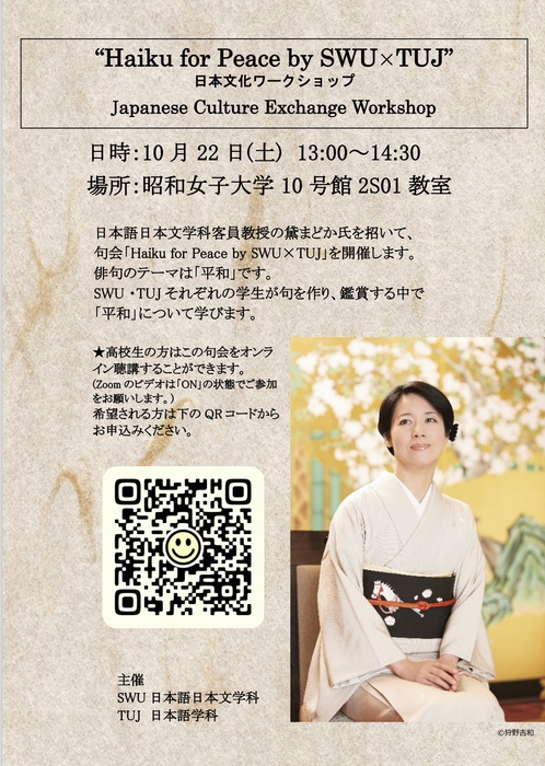 昭和女子大学 (東京都世田谷区:学長 小原奈津子) は、10月22日に日本文化ワークショップ 「Haiku for Peace by SWU x TUJ」をテンプル大学ジャパンキャンパスの日本語学科と共催します。