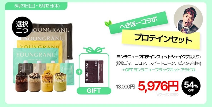 夏に向けて、体重管理や手軽な栄養補給に最適なプロテインセットとなっております。1食分(20g)のタンパク質を1回で摂取できる本製品は、水だけでもおいしくお召し上がりいただけます。わずか160kcalの低カロリーながら、豊富なトッピングで満足感のある一品に仕上げており、風味豊かな味わいも特徴です。本セットをご購入いただいたお客様全員に「ヨンラニューブラックカットアラビカ」をプレゼントいたします。この機会をお見逃しなく、ぜひお試しください!
