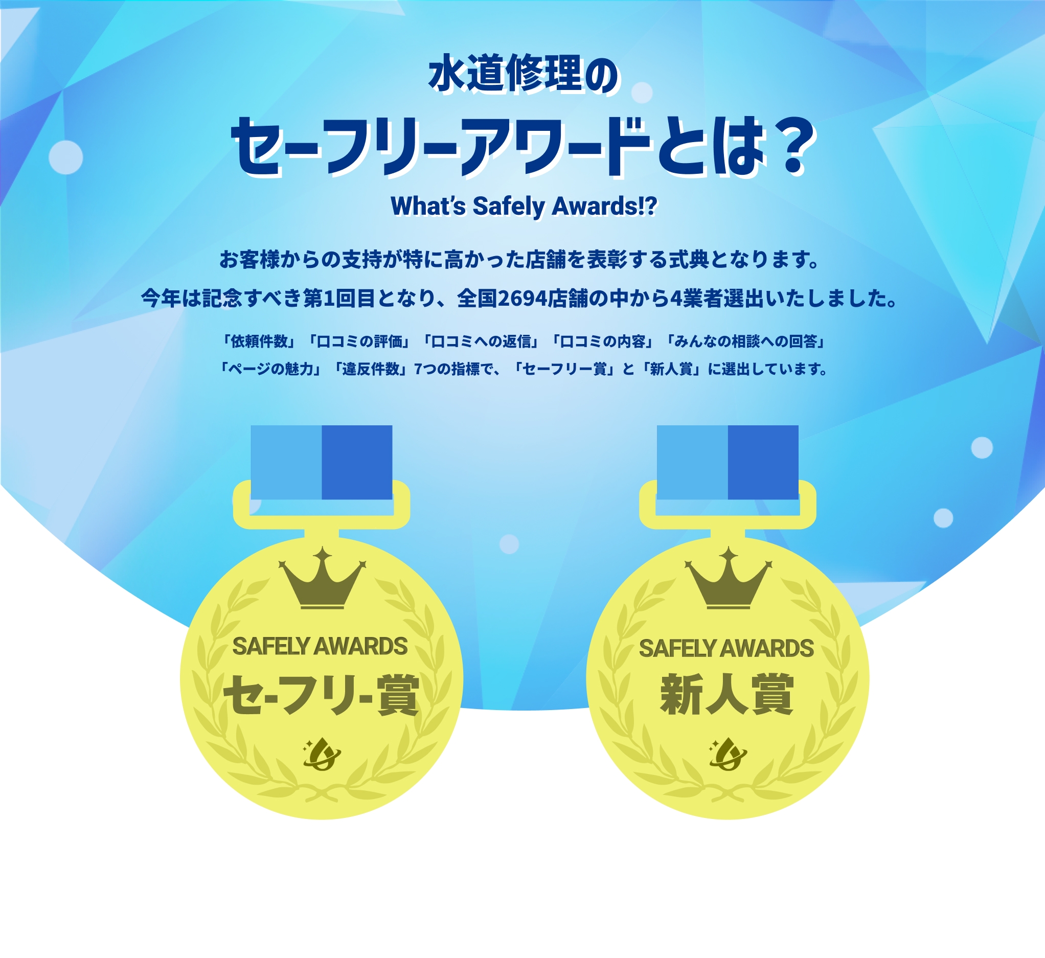 トイレや水回りのトラブル発生時、すぐに駆けつけてくれる優良な水道事業者を選べるサイト「水道修理のセーフリー」を運営する株式会社SAFELY(所在地:東京都渋谷区、代表取締役:岡野 健二)は、トイレや水回りのトラブルに迅速に対応し、顧客から高い評価を受けている優良な水道事業者を選定し、全国2,694店舗の中から4業者選出し表彰いたしました。