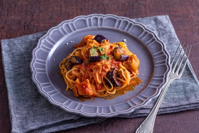 グリルした鶏もも肉と千両ナスの旨みが染み込んだトマトソースパスタ。