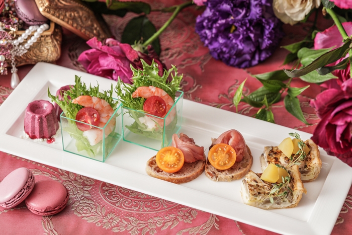 最も愛され、最も憎まれた王妃“マリー・アントワネット”がテーマのアフタヌーンティー。 スイーツスタンドの1段目は、アントワネットを象徴する花として有名であり、ルイ16世から贈られた離宮「プチ・トリアノン」に咲く“美しい薔薇”を、“プリンセスパフェ~薔薇香るルビーショコラ~ ”と“ラズベリーローズシュー”で表現。プリンセスパフェには、王妃の証である“ティアラ”をあしらいました。2段目は、アントワネットが愛したダイヤモンドやルビー、クリスタルなどの豪華ジュエリーを、フランス伝統菓子のタルト・マカロン・ブランマンジェで煌びやかに表現。3段目は、装飾家のシャルル・ル・ブランによる見事な天井壁画が美しい“鏡の間”をイメージした “カシスオペラ~ヴェルサイユの壁画~ ”と、1匙の中でルビーショコラの魅力を表現した“アート・ルビーショコラ”で、豪華絢爛を極めた宮殿の “フランス芸術”を表現しました。