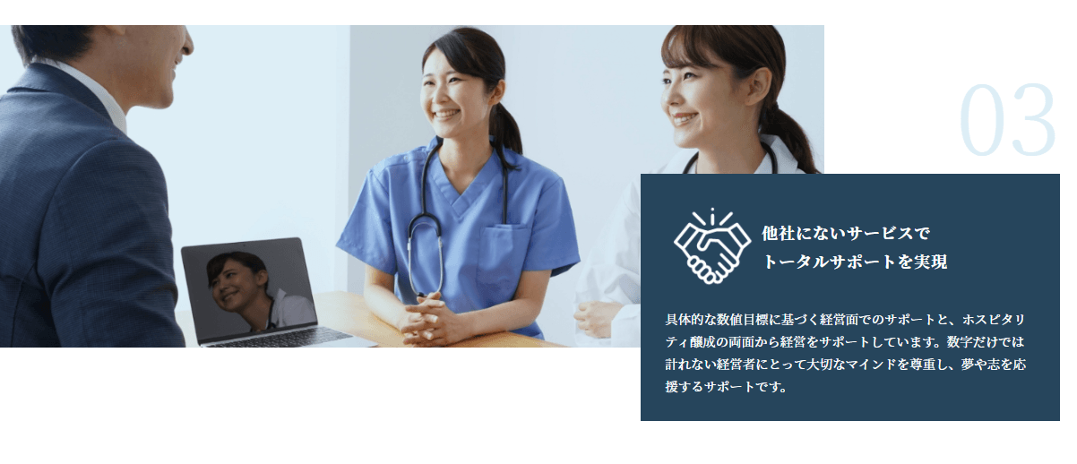 外来から訪問歯科診療まで、具体的な数値目標に基づく経営面でのサポートと、ホスピタリティ醸成の両面から経営をサポートしています。数字だけでは計れない経営者にとって大切なマインドを尊重しつつ、成功への確実なサポートをいたします。