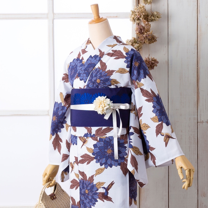今年の新作浴衣のテーマは「花鳥柄」。長年にわたり京友禅などを手掛けてきた京都の図案屋の、熟練の職人による手描きデザインを起用した。京友禅のデザインの特徴は草花や動物を絵画的に描いている点。今季浴衣も、昨年に引き続きトレンドとなっているくすみ色の地色に、絵画的な花鳥を描いた4柄2配色の8種類となっている。