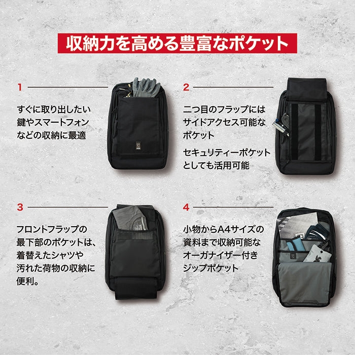 さらに防水ポケットや15インチPCスリーブも装備。 別売りのSAFETY POCKET SHOULDER BAGや、 SLING BAGなどを併用すれば機能性はさらに高まる。
