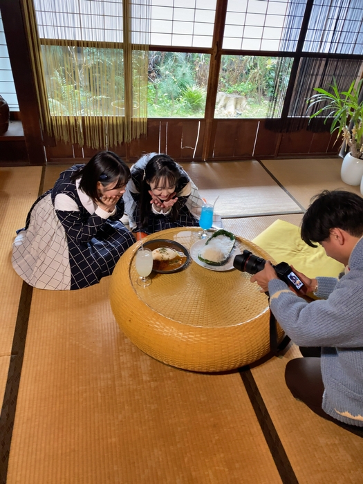 商店街の料理店で絶品グルメに舌鼓を打ちながらシャッターを切る田津原さん。しかしいつしか「食レポギャグ対決」が発生。追い込まれた芸人の姿がここに!