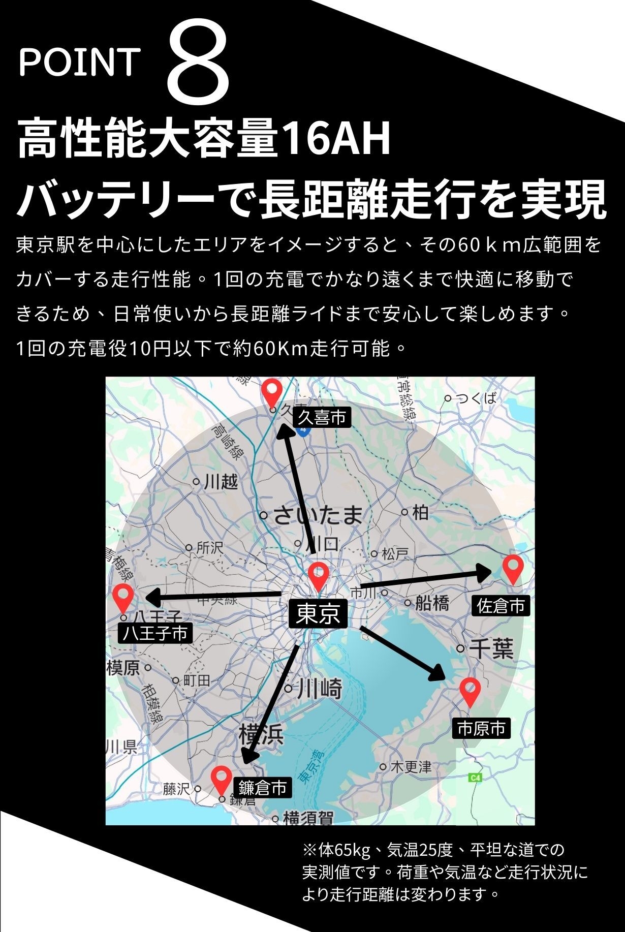 東京駅を中心にしたエリアをイメージすると、その70km広範囲をカバーする走行性能。1回の充電でかなり遠くまで快適に移動できるため、日常使いから長距離ライドまで安心して楽しめます。1回の充電約15円以下で約70Km走行可能。