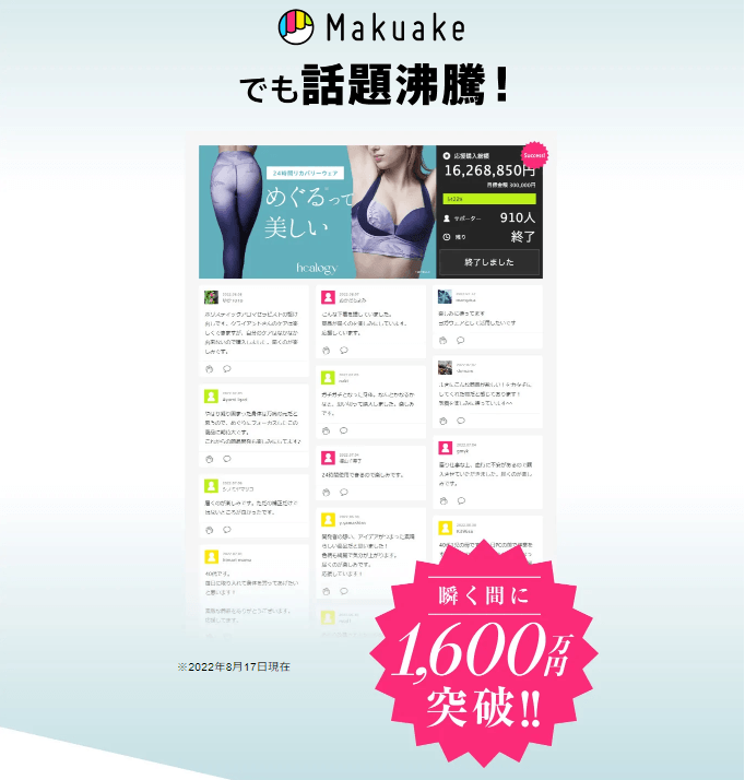 6月30日より応援購入サイト「Makuake」にて先行販売をしたhealogy(ヒーロジー)リカバリーブラ&レギンスは、910人のサポーターに支えられ1600万円を超える応援購入をいただきました。