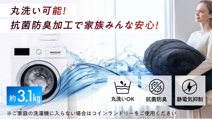 抗菌・防臭・静電気防止加工により、いつでも清潔に保てます。さらに洗濯機で丸洗いが可能なため、家族みんなが安心してお使いいただけます。