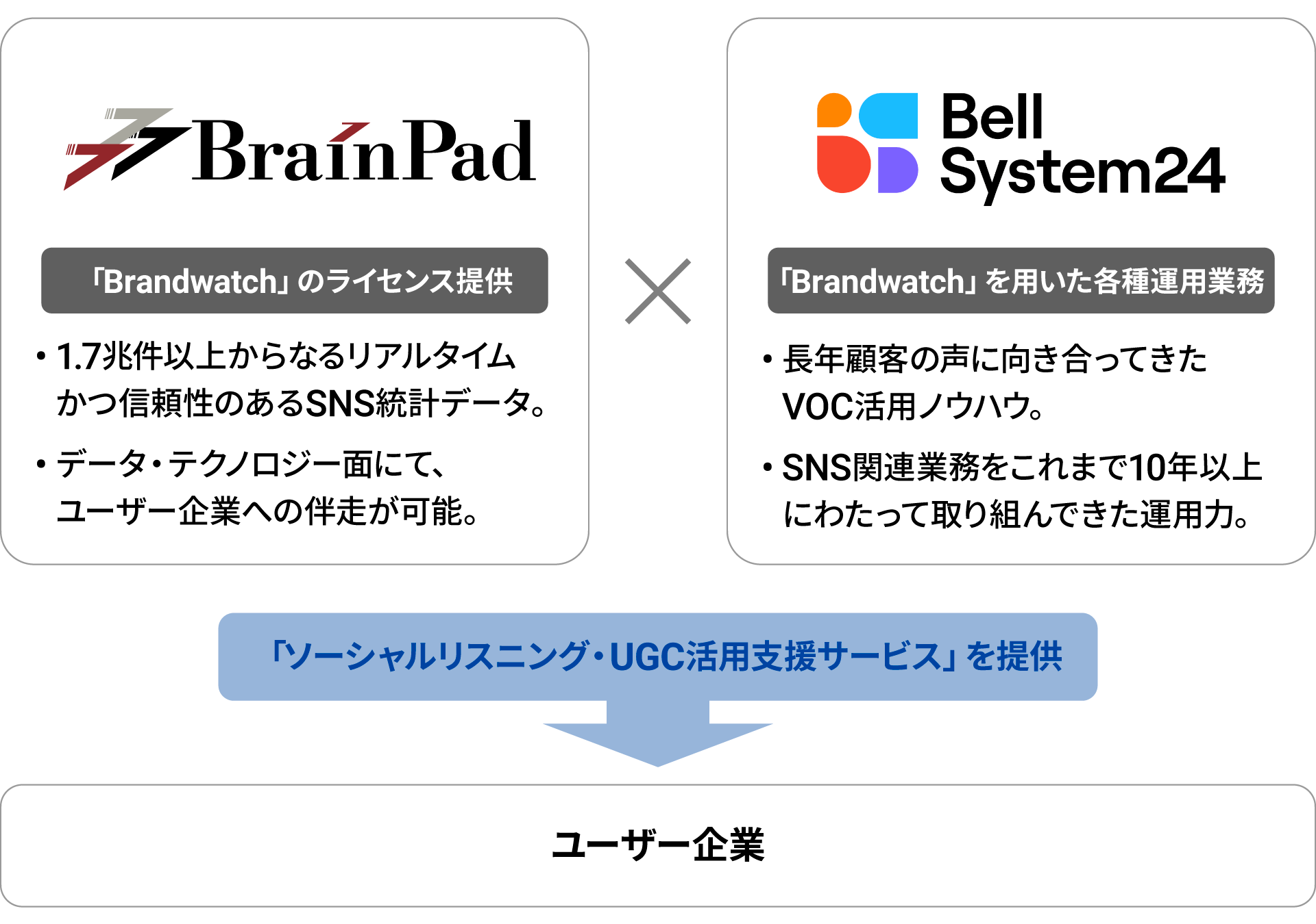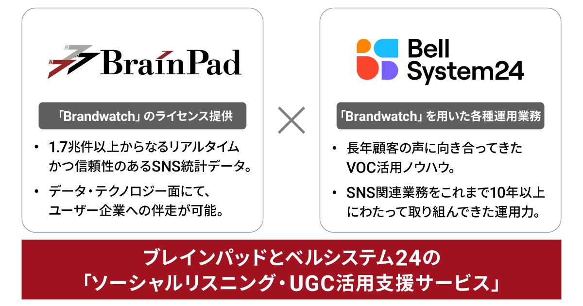 株式会社ブレインパッド(本社:東京都港区、代表取締役社長 CEO 関口 朋宏、以下:ブレインパッド)と株式会社ベルシステム24(本社:東京都中央区、代表取締役 社長執行役員 梶原 浩、以下:ベルシステム24)は、ブレインパッドが提供するSNS分析ツール「Brandwatch Consumer Reserach(以下:Brandwach、ブランドウォッチ)」を用いた、UGC(User Generated Content:ユーザーが自発的に発信する口コミやレビューなどのコンテンツ)の収集・分析によるソーシャルリスニング・UGC活用の企画立案から施策の実行、運用までを一気通貫に支援・代行するサービスを提供開始いたします。