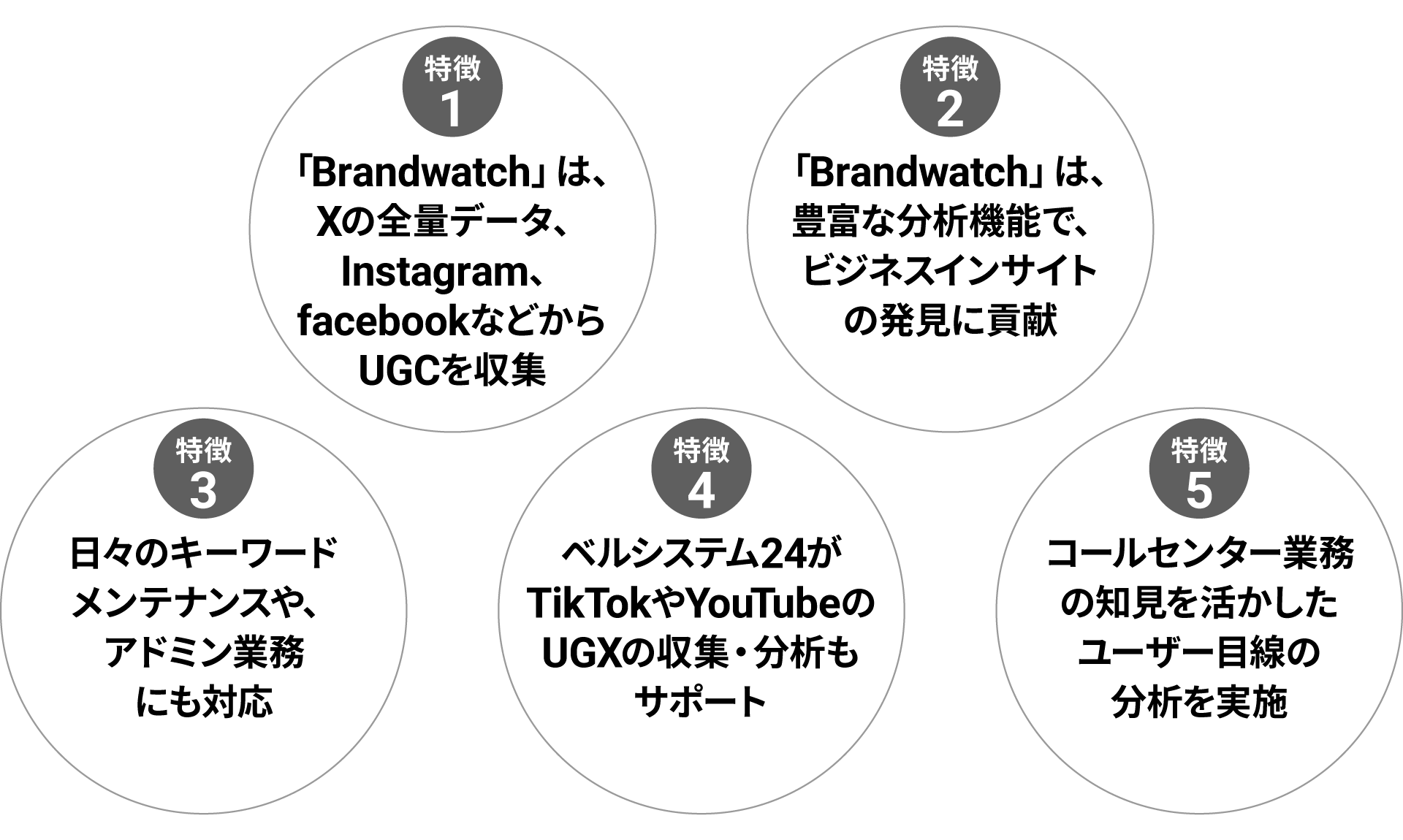 ※ベルシステム24では、「Brandwatch」で取得できるX、Instagramに加えて、TikTokやYouTubeなどの動画コンテンツにおけるUGCを、人的リソースをかけて収集・分析いたします。