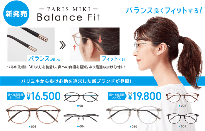 つるの両先端に「おもり」を装着することにより、レンズとの重心がつり合うよう設計された新しいフレームです。重心が耳の後ろに移動することでフレームのズレや疲れが軽減され、安定した快適な掛け心地を実現します。この機会にお近くのパリミキでお試しください!