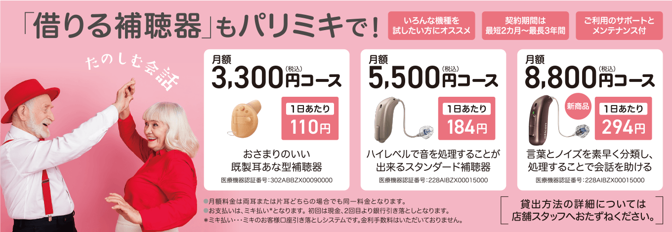 月額税込3,300円~ 定額にて補聴器を貸し出しいたします。使えるようになるか不安な方は、まずは補聴器を借りることから始めてみませんか? また、ご購入をご希望の場合は両耳84,000円(非課税)~ お求めいただけます。