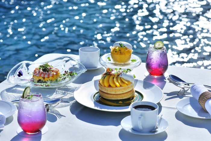 前菜、メイン、デザートの3品全てに旬のマンゴーを使用したコース仕立ての朝食を用意します。前菜は爽やかな酸味を感じる車エビのセビーチェに、甘みのあるマンゴーをバランス良く合わせたサラダ。メインは旨味が溢れるマンゴーとほどよい塩気の生ハムをトッピングした焼きたてのパンケーキ。コース最後にマンゴーの濃厚な味わいを存分に楽しめるデザートを提供します。朝焼けやプールの水面が煌めく光景の中、夏の旬を味わう朝食を楽しむことができます。