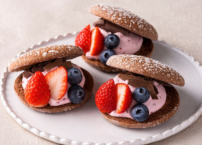 甘酸っぱいフランボワーズジャムを入れた乳脂肪分40%の濃厚な生クリームと、ふんわりやわらかなショコラ生地を合わせました。ブルーベリーと苺、チョコをトッピングした見た目もかわいい期間限定の生ナボナです。