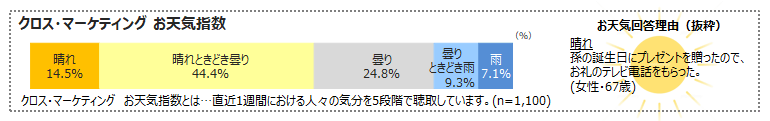 クロス・マーケティングお天気指数とは、直近1週間における人々の気分をお天気で表したものです。お天気の理由も一部抜粋してお知らせします。