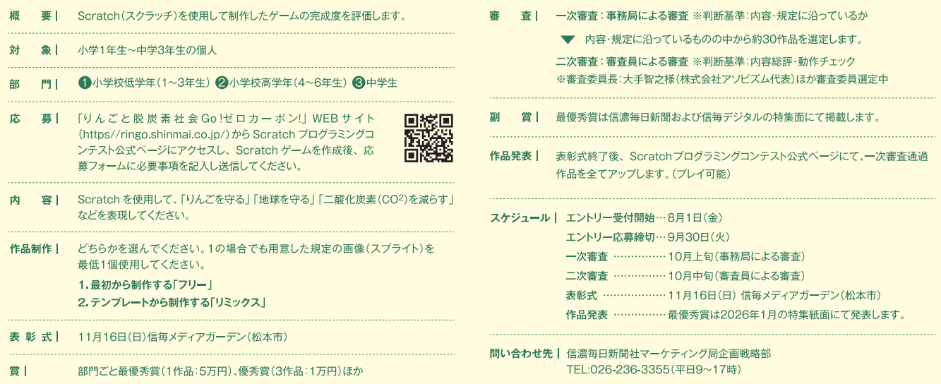 2年目となる今年は、プロジェクトの一環として、未来を担う子どもたちに、Scratchゲーム作りを通して環境保護意識を高めてもらうため、「Scratch プログラミングコンテスト~信州りんごの未来を救え!~」を開催します。子どもたちが環境保護について考え、大胆な発想と創造力で制作したScratch作品のご応募をお待ちしております。