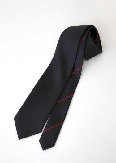 タイは、大剣に無地、小剣にチームカラーである青赤のストライプを控えめに入れたデザインを採用。