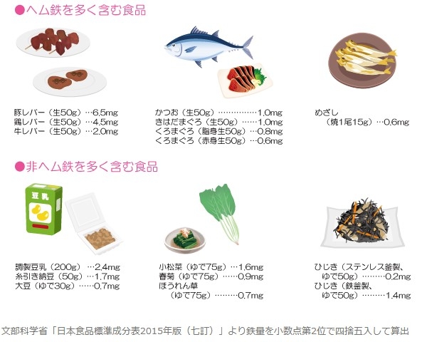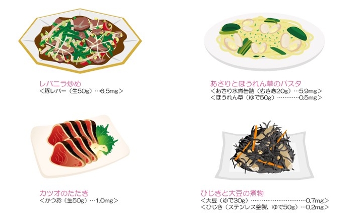 貧血を予防するためにはまず、毎日失われる鉄を食事からしっかりとることが必要です。主な食品の目安量に含まれる鉄量は下記の通りです。