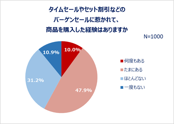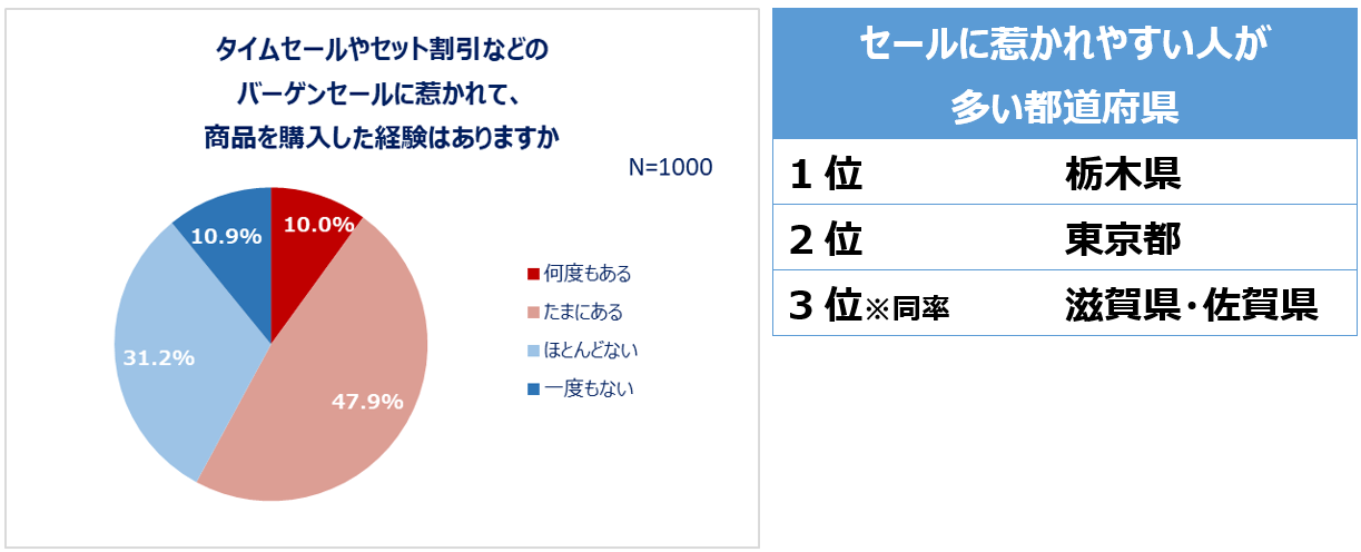 タイムセールやセット割引などのバーゲンセールに惹かれて、商品を購入した経験が「何度もある」「たまにある」と回答した人は、全体の約6割でした。セールに惹かれやすい人が多い都道府県の1位は「栃木県」でした。