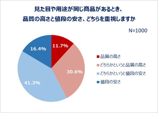商品の購入を決める際は、品質や値段など、様々な検討基準があります。見た目や用途が同じ商品があるとき、品質の高さと値段の安さどちらを重視するか聞いたところ、「値段の安さ」を重視する人が多数派でした。買い物をするならより安く、お得に購入したいという人は多いと考えられます。