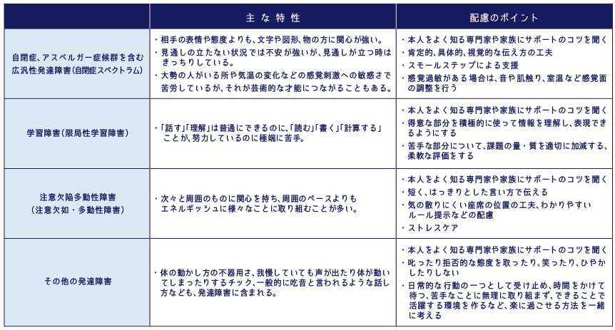 出典:厚生労働省 発達障害のある方と共に働く上でのポイントと障害特性 発達障害の特性(代表例)https://www.mhlw.go.jp/seisakunitsuite/bunya/koyou_roudou/koyou/shougaishakoyou/shisaku/jigyounushi/e-learning/hattatsu/characteristic.html