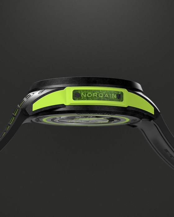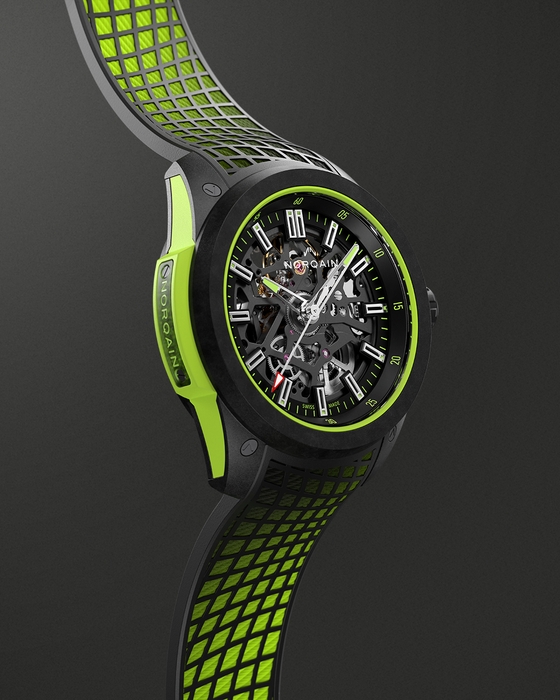 黄緑のアクセントを配したスケルトン仕様のブラックダイヤルの奥には、クロノメーター認定を受けた自動巻きスケルトンムーブメント「ノルケイン キャリバー NB08S」が搭載されており、41時間のパワーリザーブを備えています。