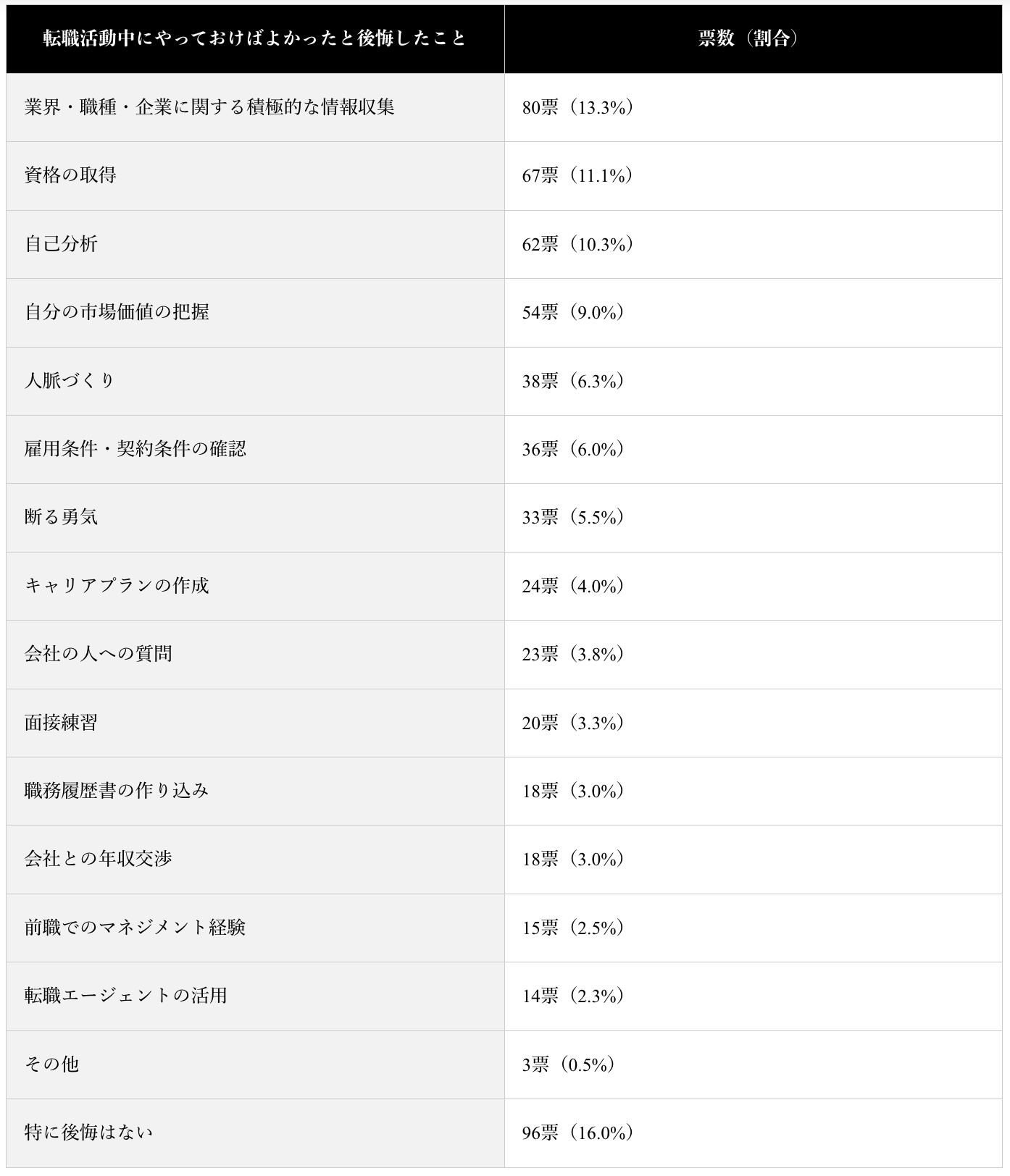 転職活動中にやっておけばよかったと後悔していることについてアンケートを行った結果は以下の通りです。
