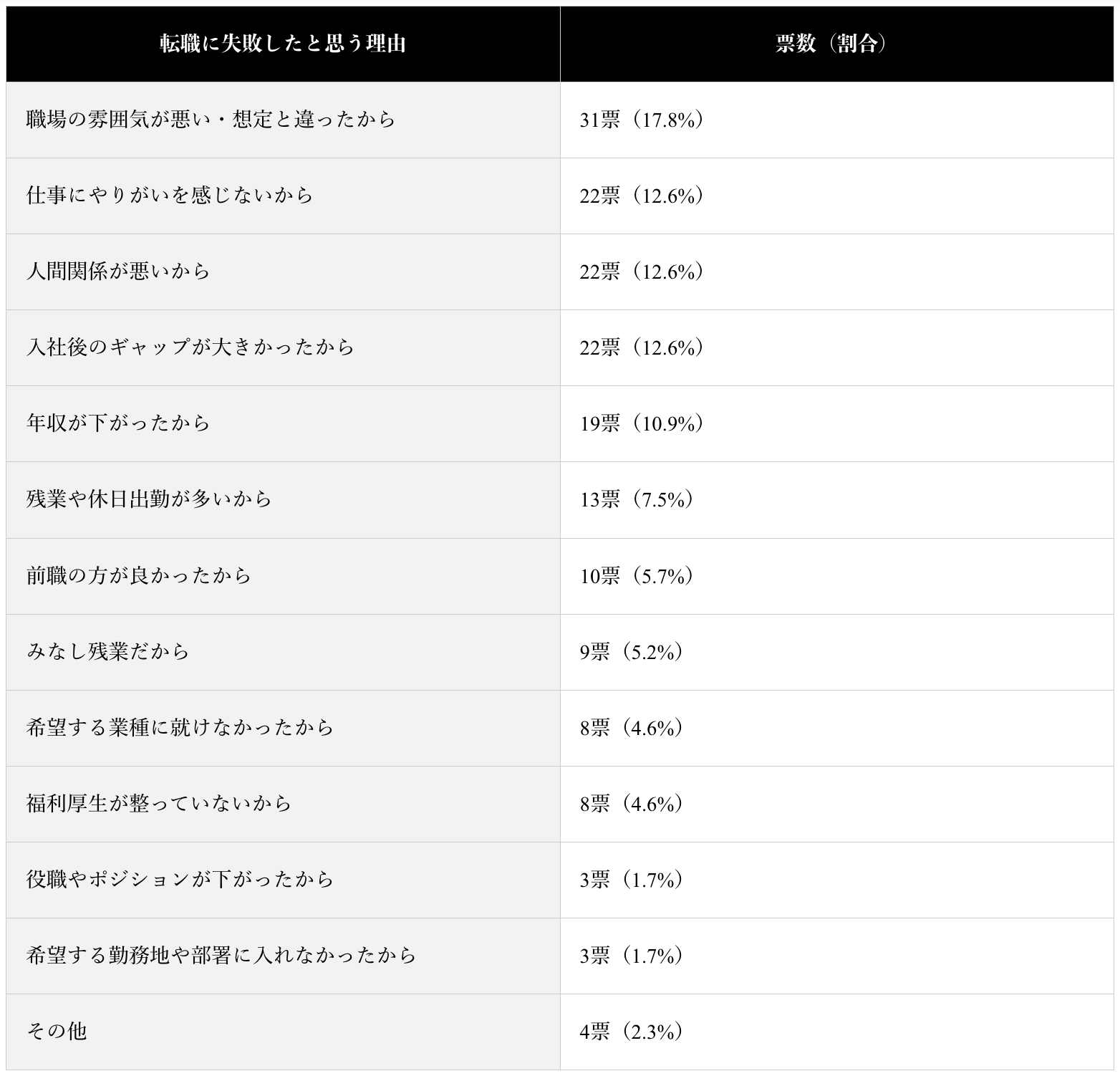 転職に失敗したと思う理由のアンケート結果は以下の通りです。