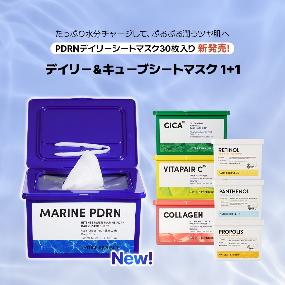 ネイチャーリパブリック人気NO.1「デイリーシートマスク」より11月14日、新商品「マリンPDRNシートマスク」が登場いたしました。こちらの新商品を含む7種類のデイリーシートマスクからご自身の肌悩みに合わせて選べる1+1セットで販売いたします。1枚のシートに美容液をたっぷり含み、毎日使いできる時短スキンケアを体験してみてください。