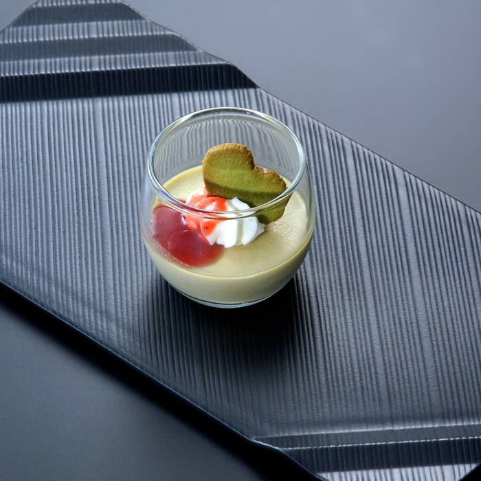 甘さの中にほろ苦さがあるチョコレートのムースを閉じ込めた一品。ビターなチョコレートムースに、ベリーのクーリでアクセントを、モナカで食感を加えています。