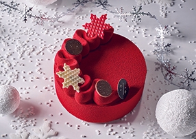 ベルギー王室御用達の「ピエール マルコリーニ」。カカオの豊かなアロマとビターチョコレートの苦みにカシスの酸味、マロンの風味がバランスよく調和。鮮やかな赤いデコレーションの上には雪の結晶を象ったオーナメント。聖夜の夜を華やかに彩る、ピエール マルコリーニならではのクリスマスケーキを販売。