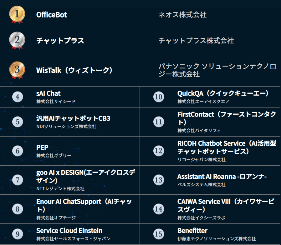 ネオス株式会社の提供する「OfficeBot」が1位となりました!OfficeBotは社内問合せ対応の効率化やナレッジマネジメントに簡単に活用できるAIチャットボットです。FAQがなくても社内文書を登録するだけで、AIが文書内を分析、自動学習し、最適な回答ができるチャットボットが出来上がります。