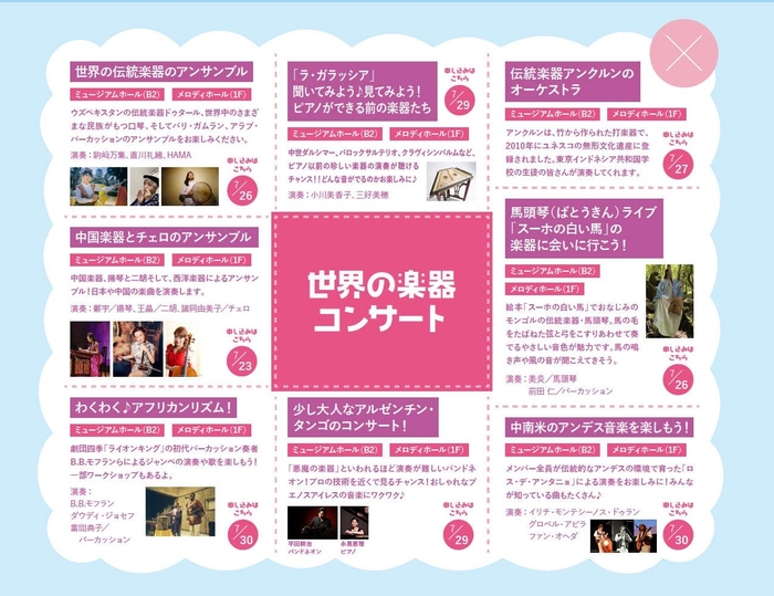 入場無料にて、「子どものための世界民族楽器展」をはじめ、世界の楽器の音色を楽しめるコンサートから、各種ワークショップ、子どものためのスペシャルコンサートなど、多彩なイベントを開催します。
