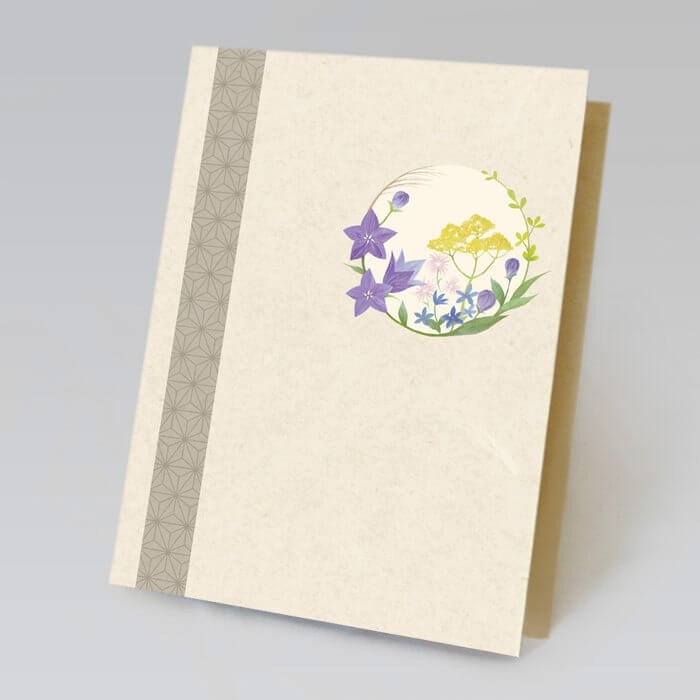 草花のリースをあしらったやわらかな風合いの台紙が、静かに故人を偲ぶ気持ちに寄り添います。
