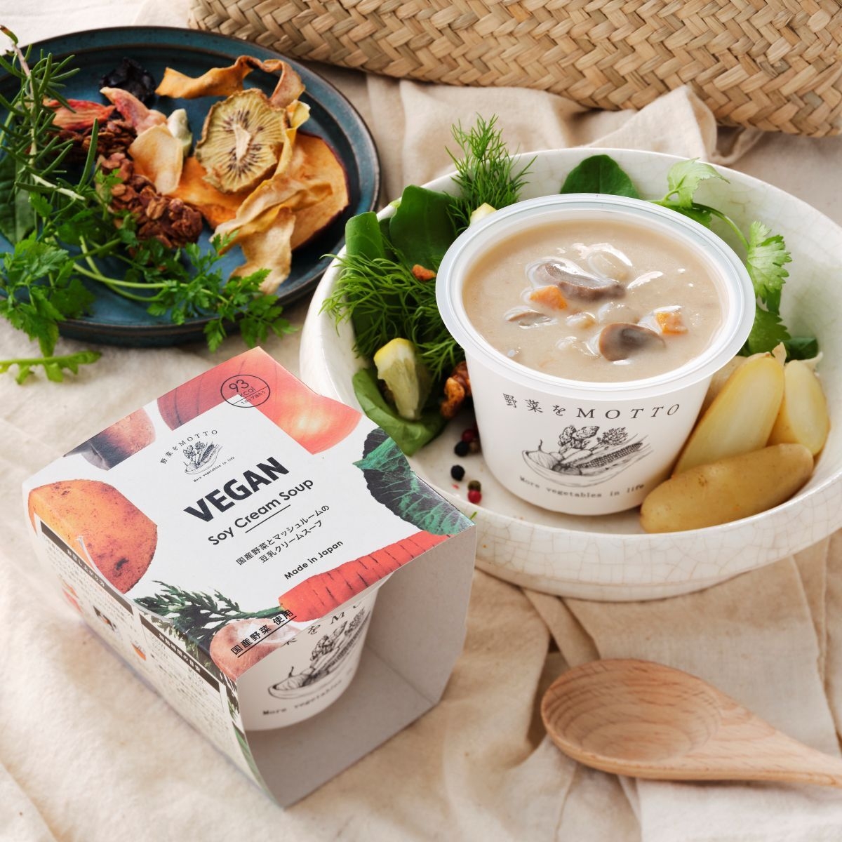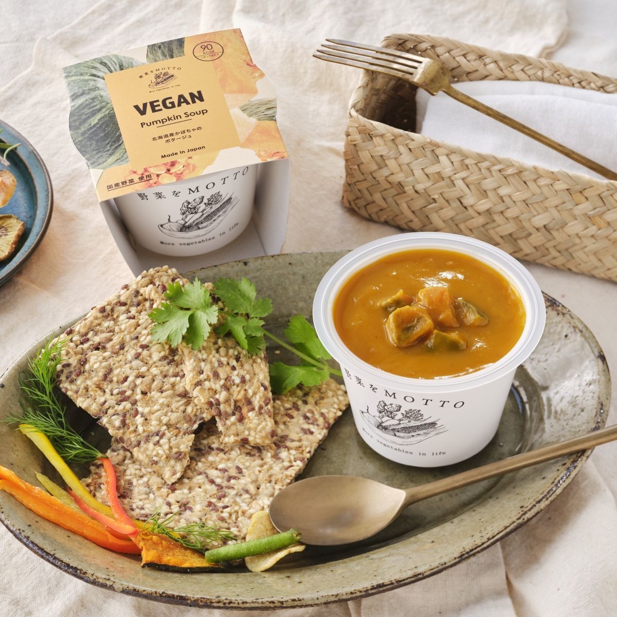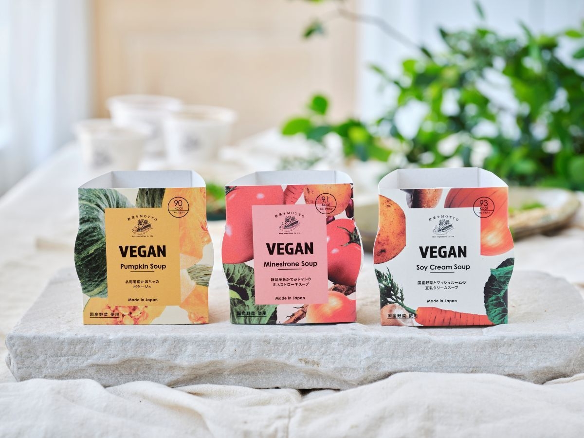 お客様からの「ヴィーガンに対応した商品はありますか?」というお声に応えるために、野菜をMOTTOからミネストローネ・かぼちゃスープ・豆乳クリームスープの3種類のヴィーガンスープが登場しました。